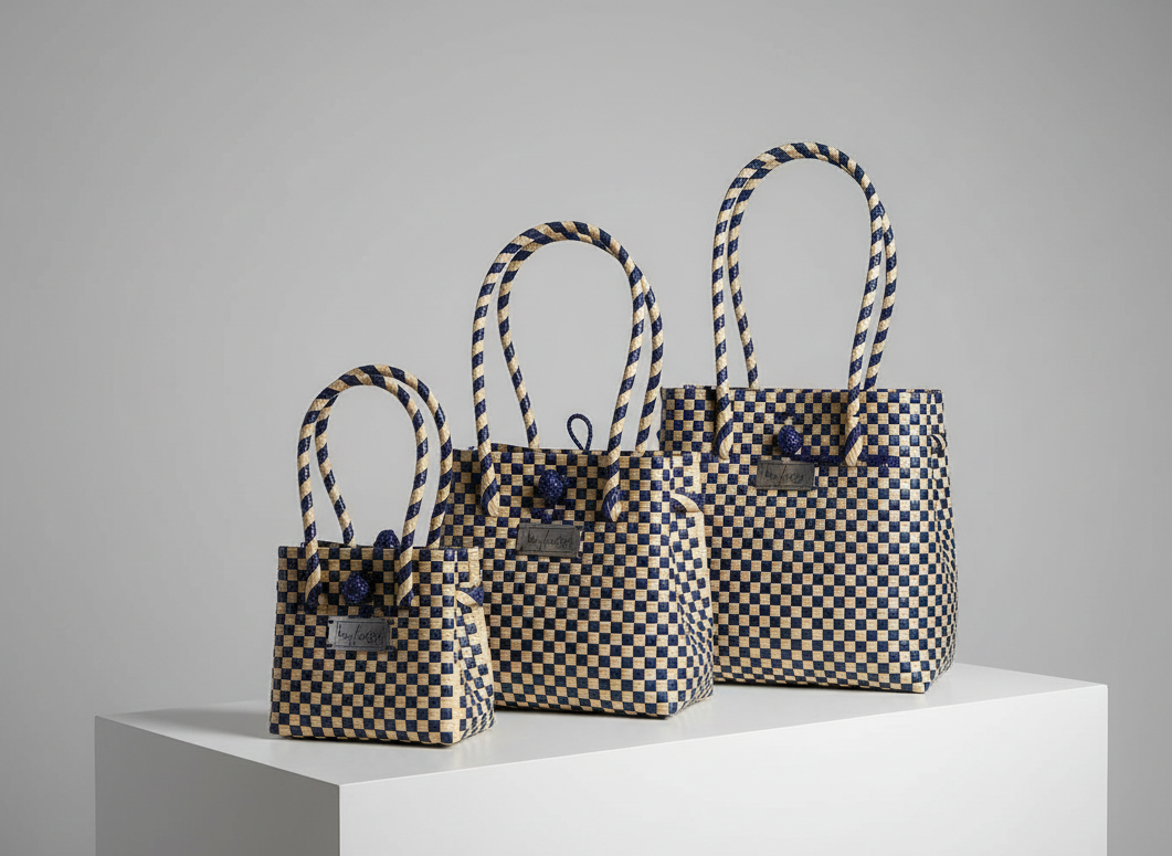 Bolso ecológico Makassar hecho a mano con plásticos reciclados. Azul marino y beige que recuerdan el mar y la historia del famoso puerto indonesio. Un bolso sostenible con estilo náutico atemporal.